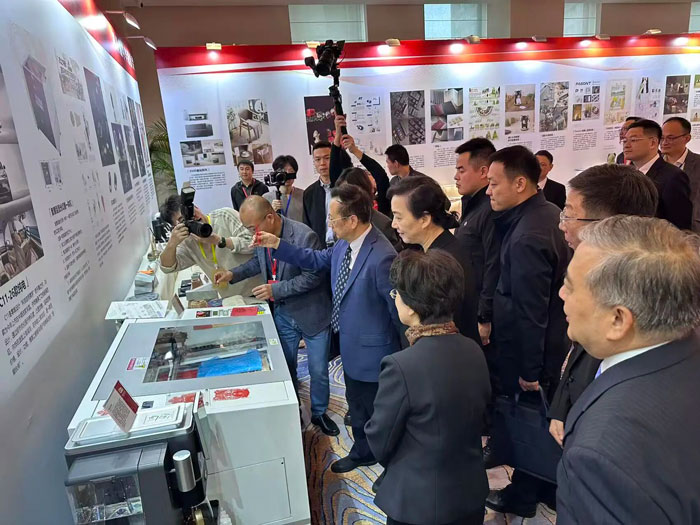 在颁奖典礼期间,一个令人振奋的场景在华之尊展区上演。全国人大常委会副委员长陈昌智在参观过程中,特意驻足华之尊展区,对HZZ-V3000智慧型激光切雕一体机表现出浓厚兴趣。陈昌智副委员长认真观摩了设备的全流程现场演示,并不时就关键问题亲切询问。他详细了解设备的市场定价、产能效率、核心技术参数以及行业应用情况,展现出对智能制造装备产业化发展的高度关切。